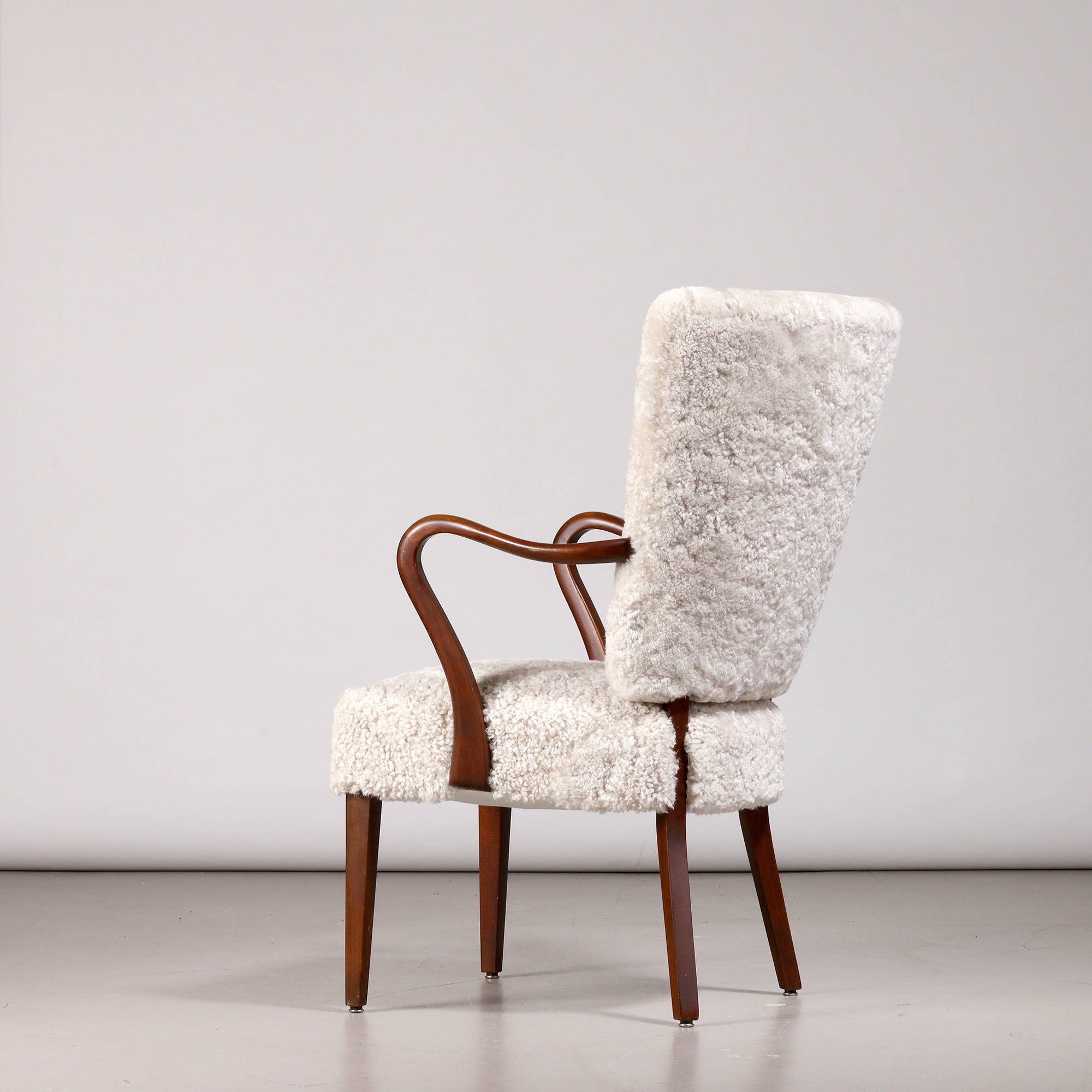 Danish armchair, model ’32’, designed by Alfred Christensen. Produced by Slagelse Møbelværk in Denmark, 1940s. Dark stained beech, recently reupholstered in light sheepskin. Second chair available, presenting a slightly lighter finish.