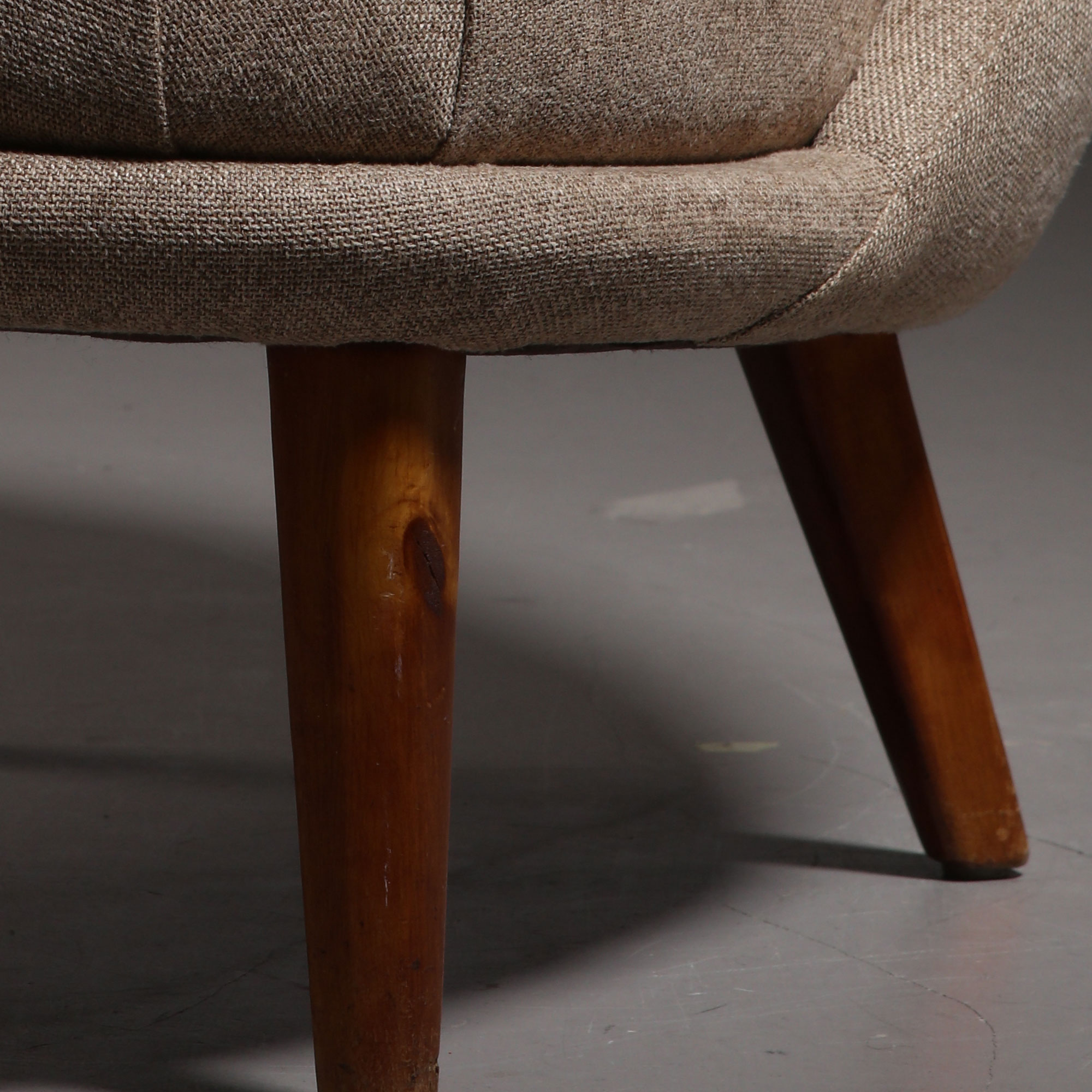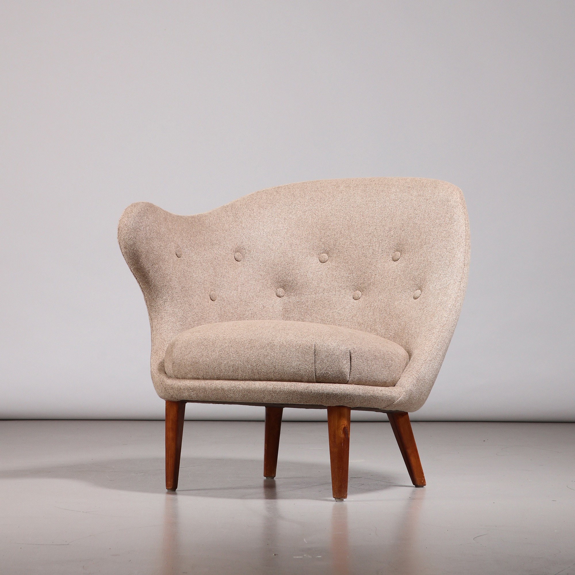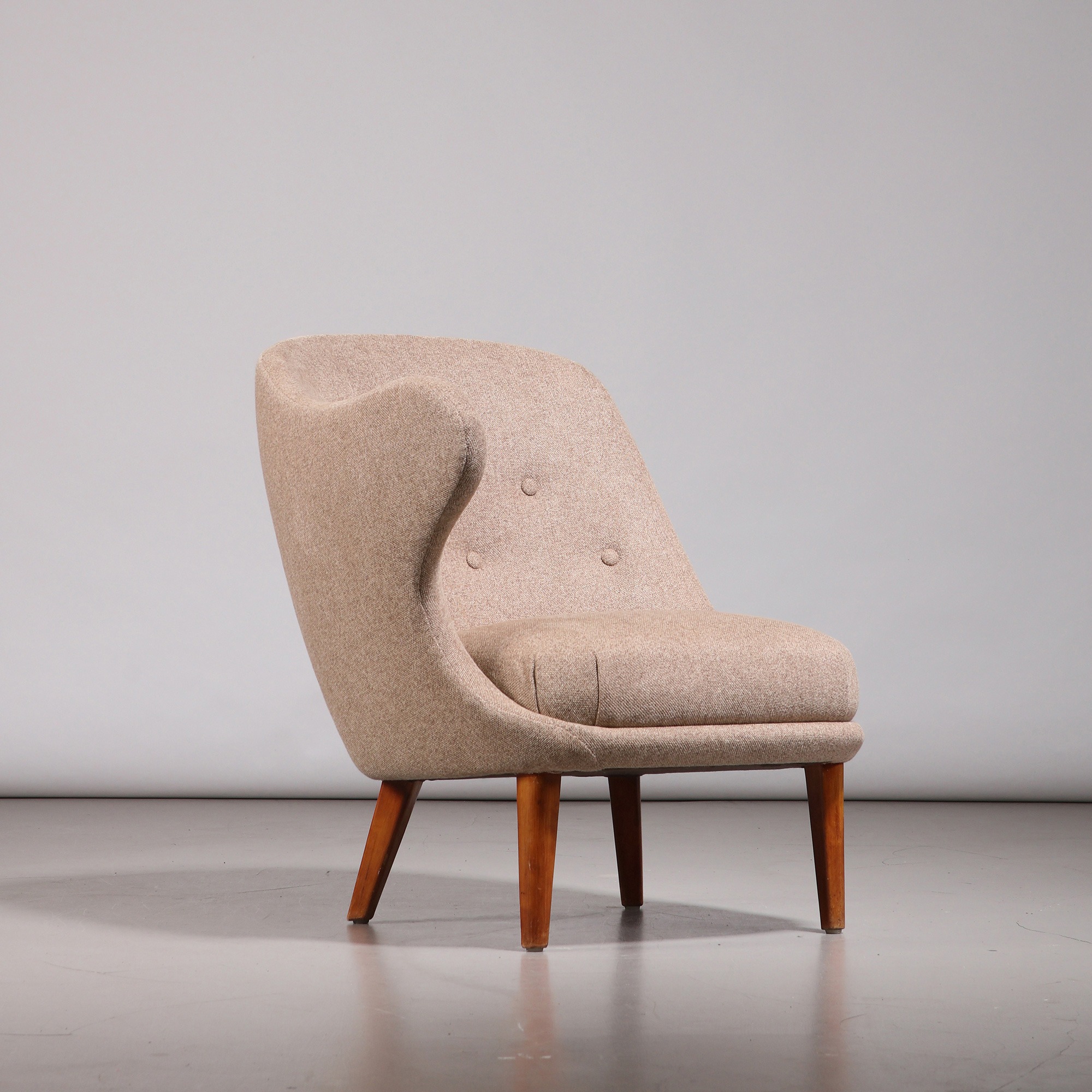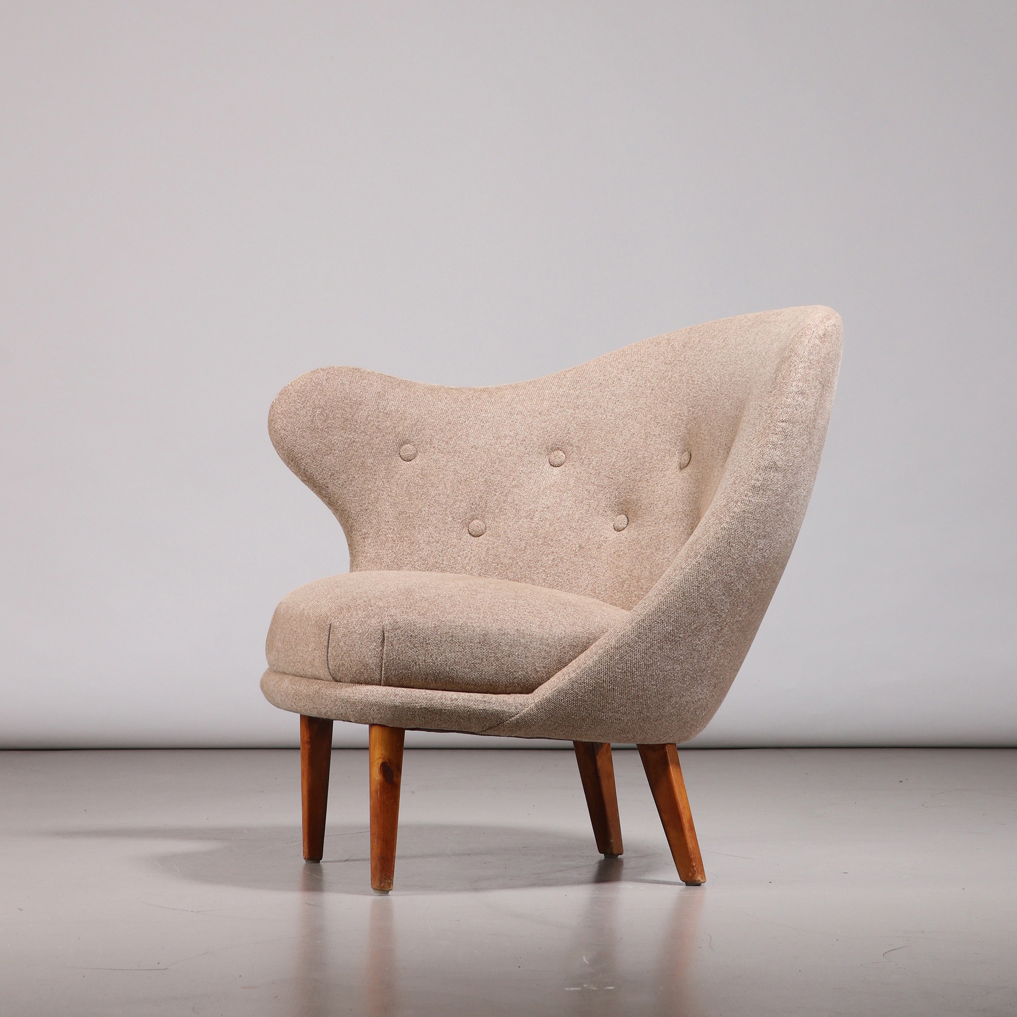 ‘Gary’ (‘The Thumb’) easy chair, designed by Arne Norell. Produced by Gösta Westerberg in Sweden, 1952. Legs in beech, recently reupholstered in fabric with tufted buttons. Legs in good original condition, with wear consistent with age and use.