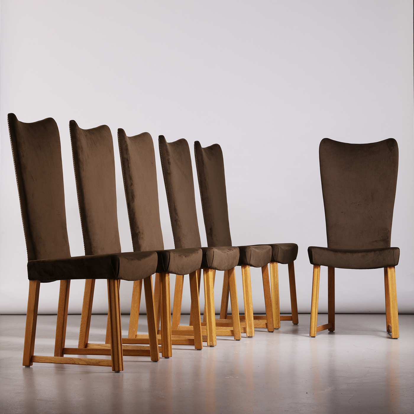 Exceptional set of six high back chairs, special commissioned model, designed by Axel Einar Hjorth, 1930s. Produced in Sweden, 1938. Oak, recently upholstered in brown velvet with metal tacks.