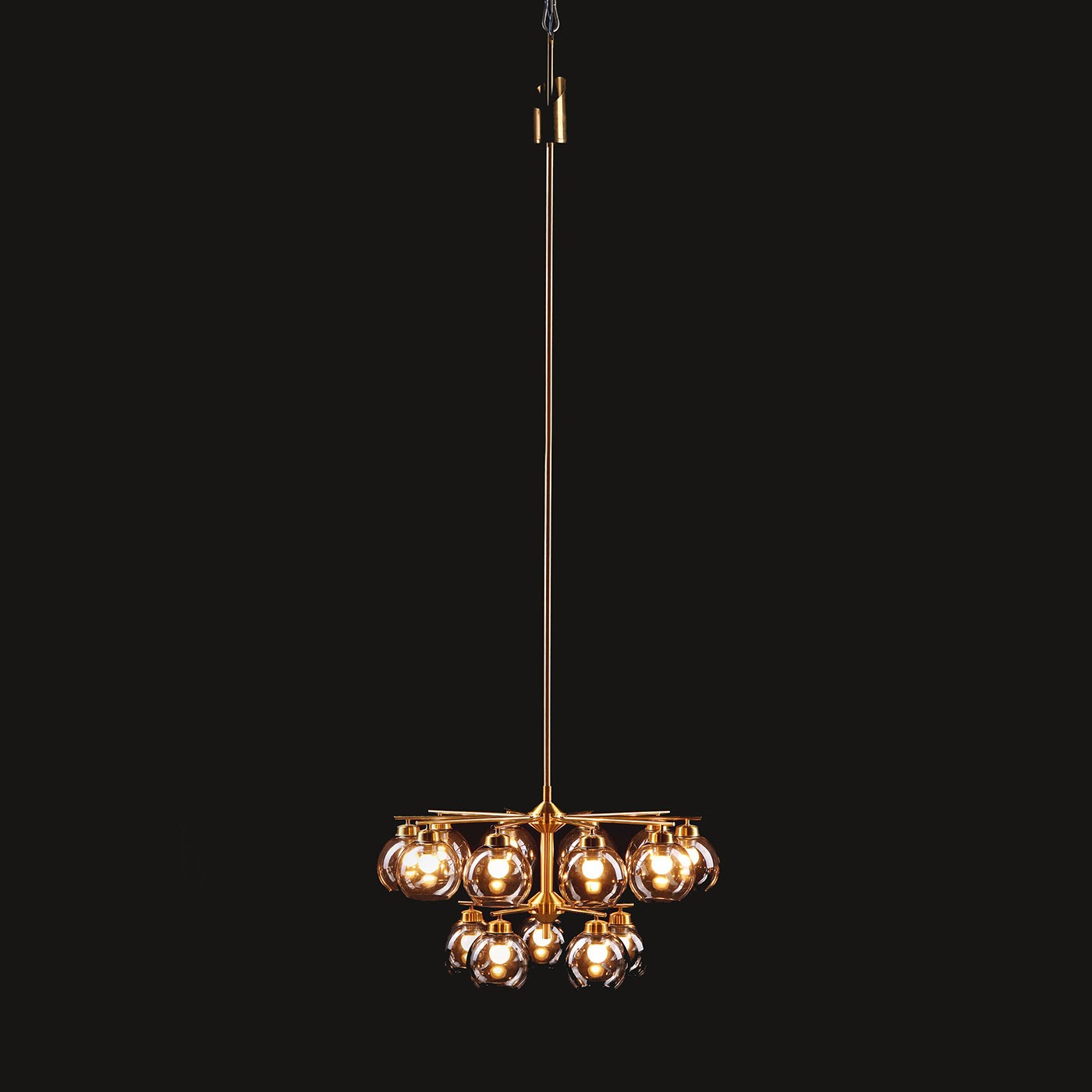 Large chandelier, designed by Holger Johansson. Produced by Westal in the 1960s. Made from brass, smoked glass shades.