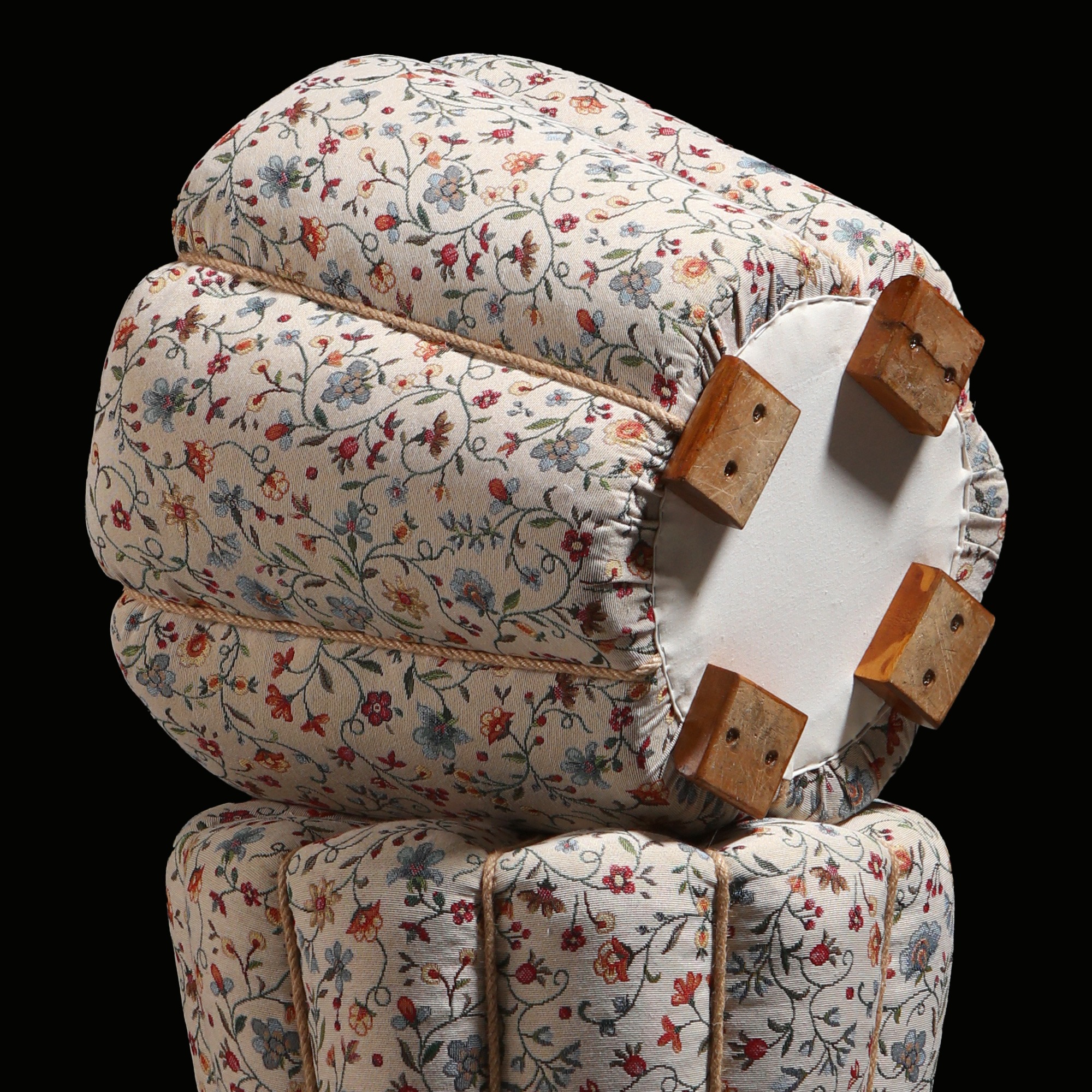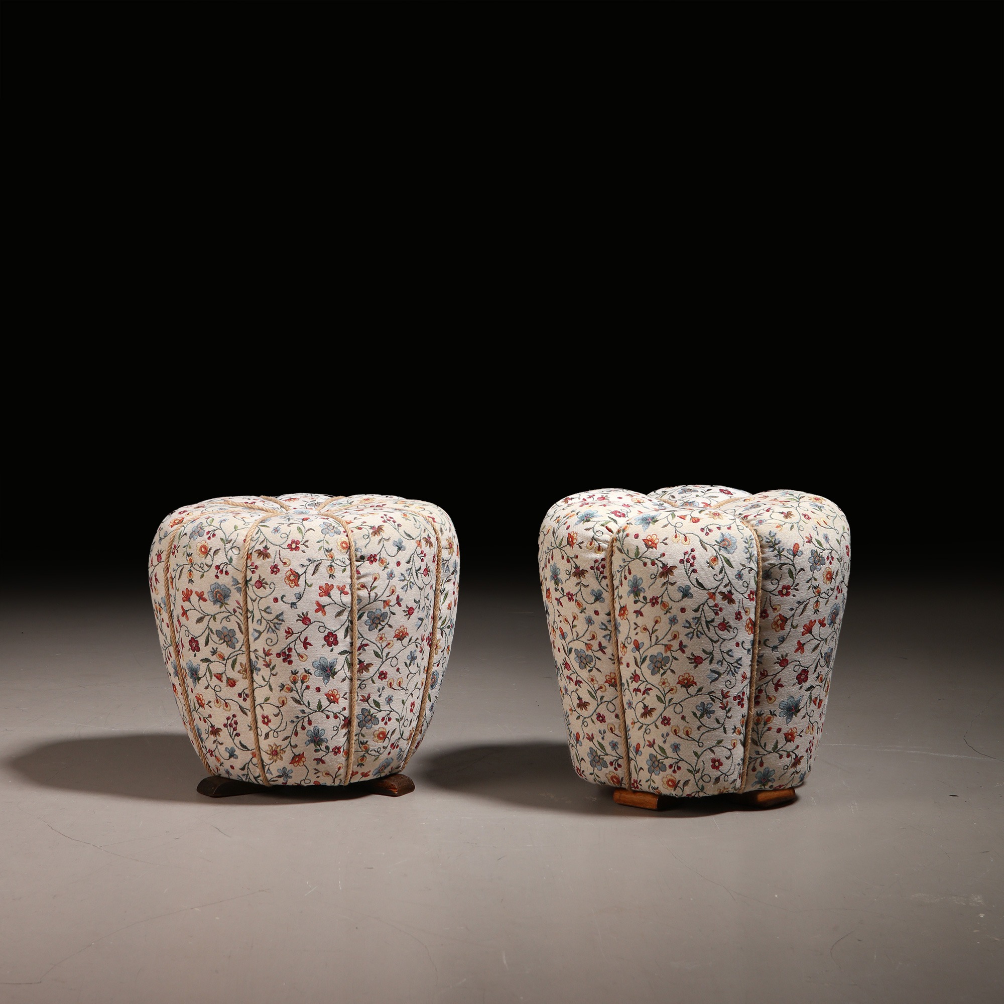 Pair of Art Deco stools, designed by Jindřich Halabala. Produced by Spojené UP závody Brno in former Czechoslovakia, 1930s. Recently reupholstered in floral tapestry fabric. The stools vary in size.