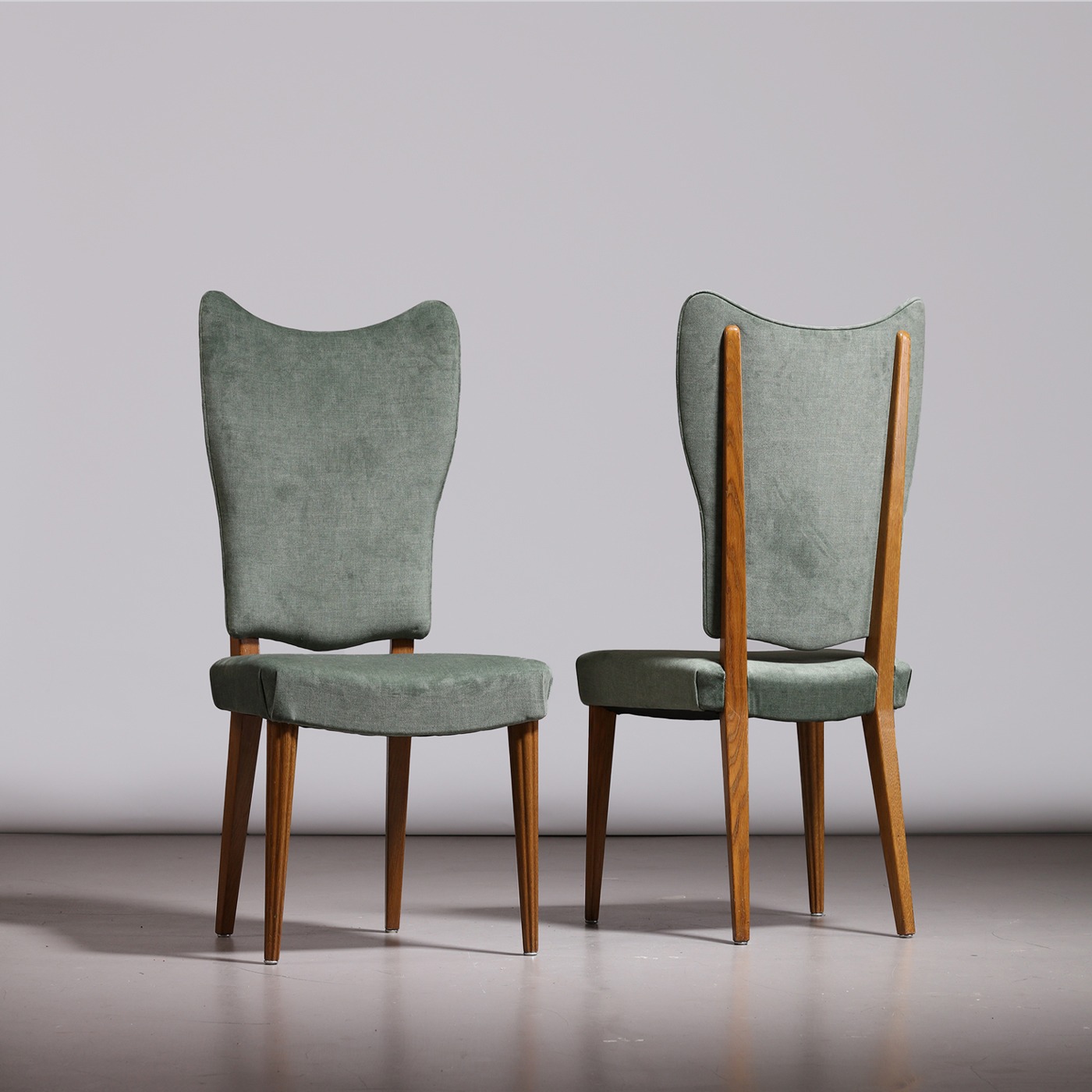 In good original condition, with wear consistent with age and use. The chairs have recently been reupholstered in green velvet upholstery.